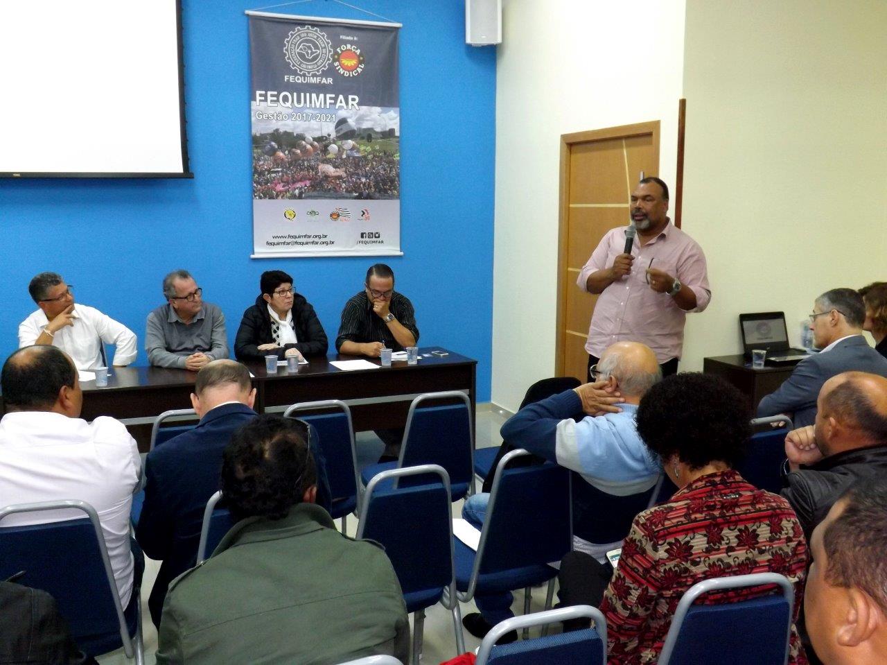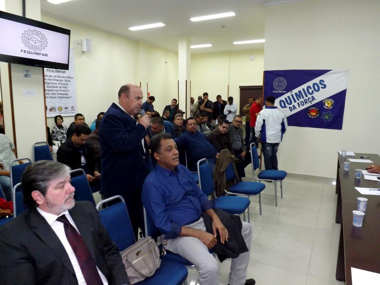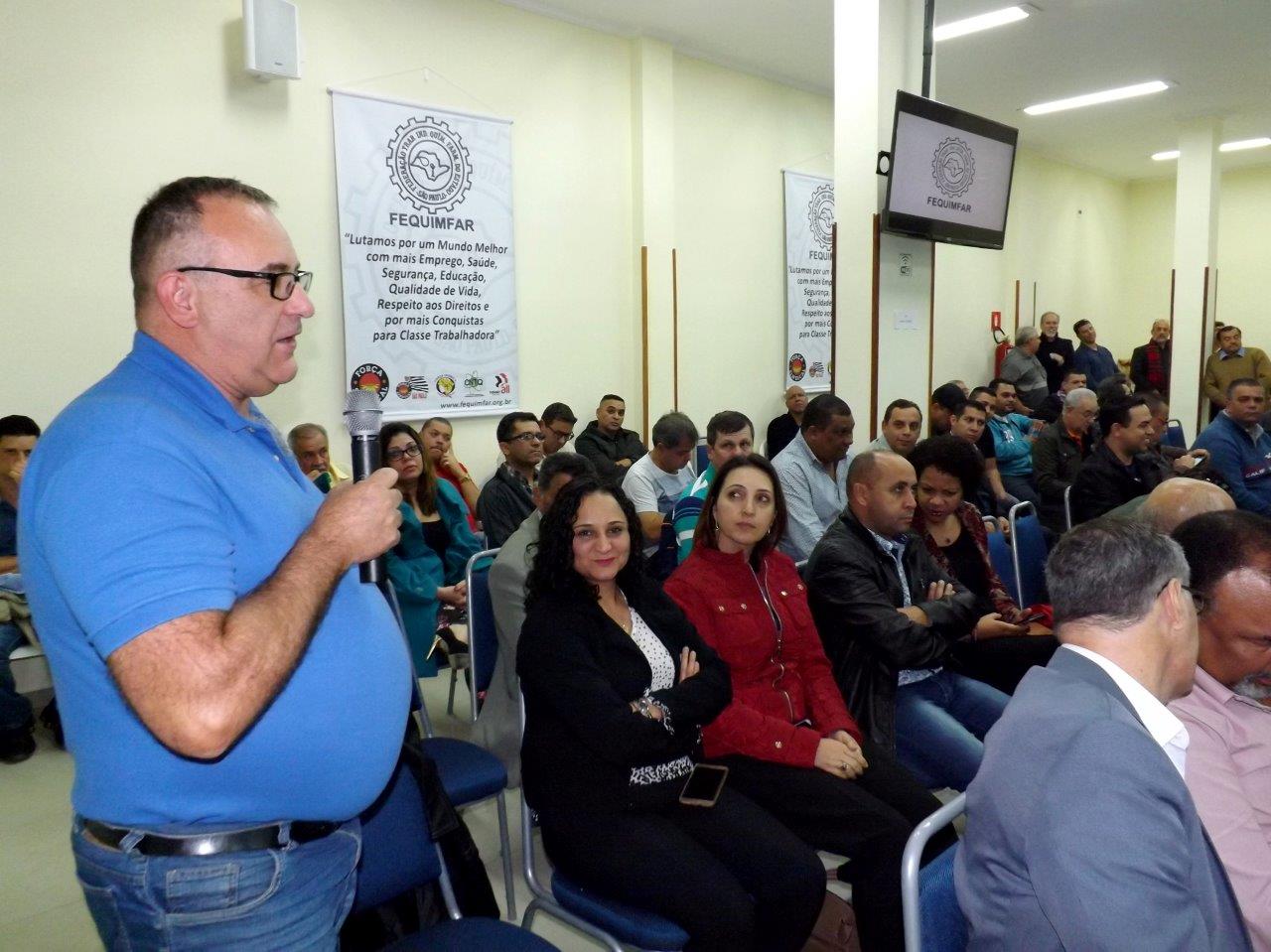 Jurandir Pedro de Souza, tesoureiro geral da FEQUIMFAR e presidente da FEQUIMFAR, fez um breve histórico da luta desde o SOS Federação e destacou o crescimento da entidade, da ação sindical e de todo o trabalho que os 33 Sindicatos filiados tem sido desenvolvido.