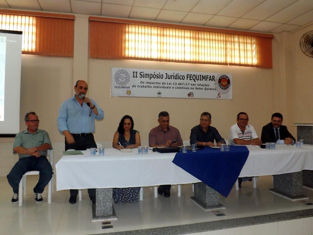 A mesa de abertura, coordenada pelo secretário geral da FEQUIMFAR e presidente do STI Bauru, Edson Bicalho, teve a participação de Sergio Luiz Leite, Serginho, presidente da FEQUIMFAR e 1º secretário da Força Sindical; Herbert Passos, presidente do STI Baixada Santista e coordenador da SNQ; Jurandir Pedro de Souza, diretor financeiro da FEQUIMFAR e presidente do STI Itapetininga; Antonio Silvan, presidente da CNTQ e do STI Guarulhos; Laura Santos, coordenadora do departamento da mulher da FEQUIMFAR e diretora do STI Itapetininga; e do advogado Cesar Augusto de Mello.